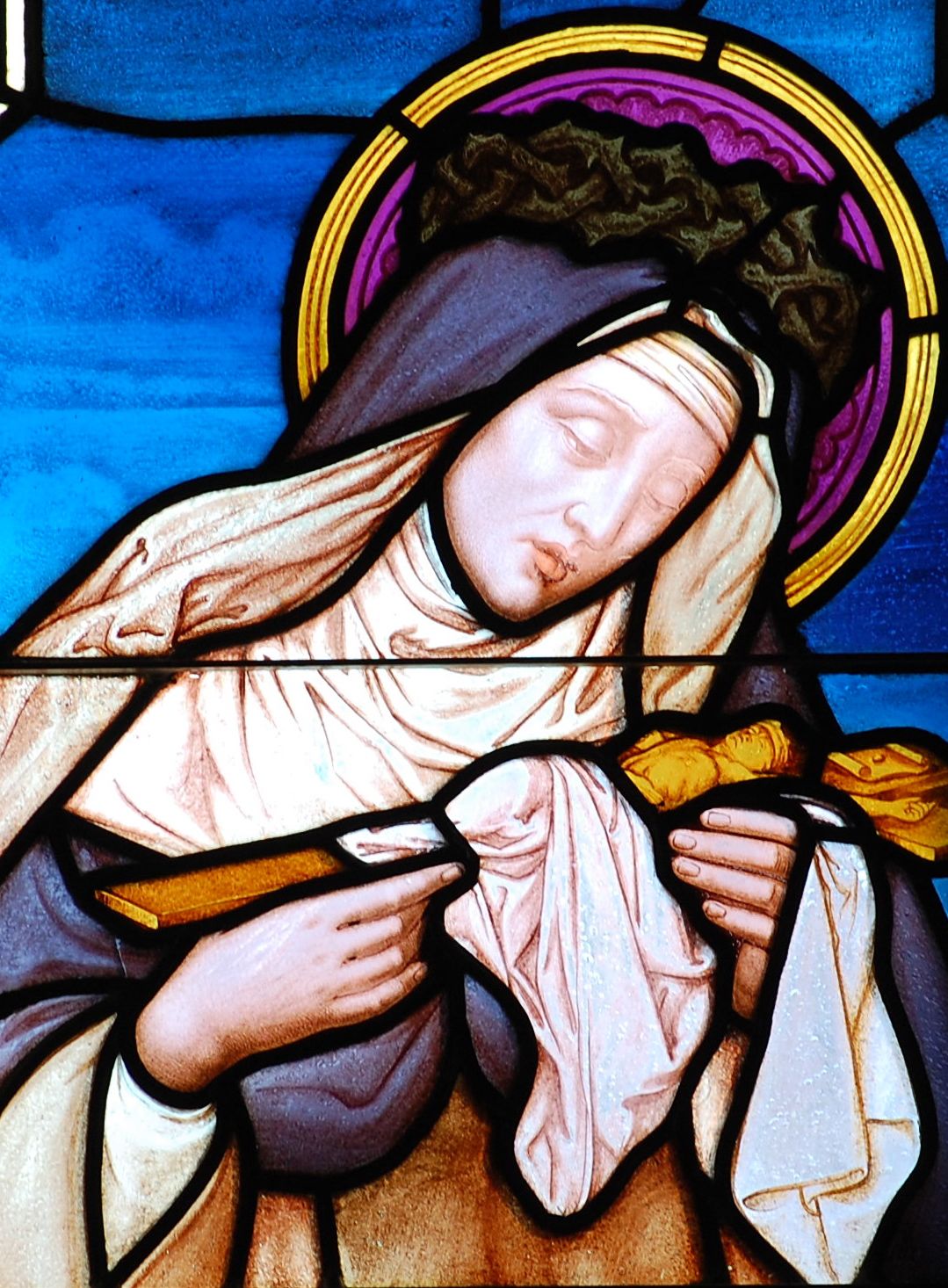 St. Catherine is shown with a Crown of Thorns, symbolizing her suffering for Jesus, also adoring the crucifix wrapped in the Dominican habit.